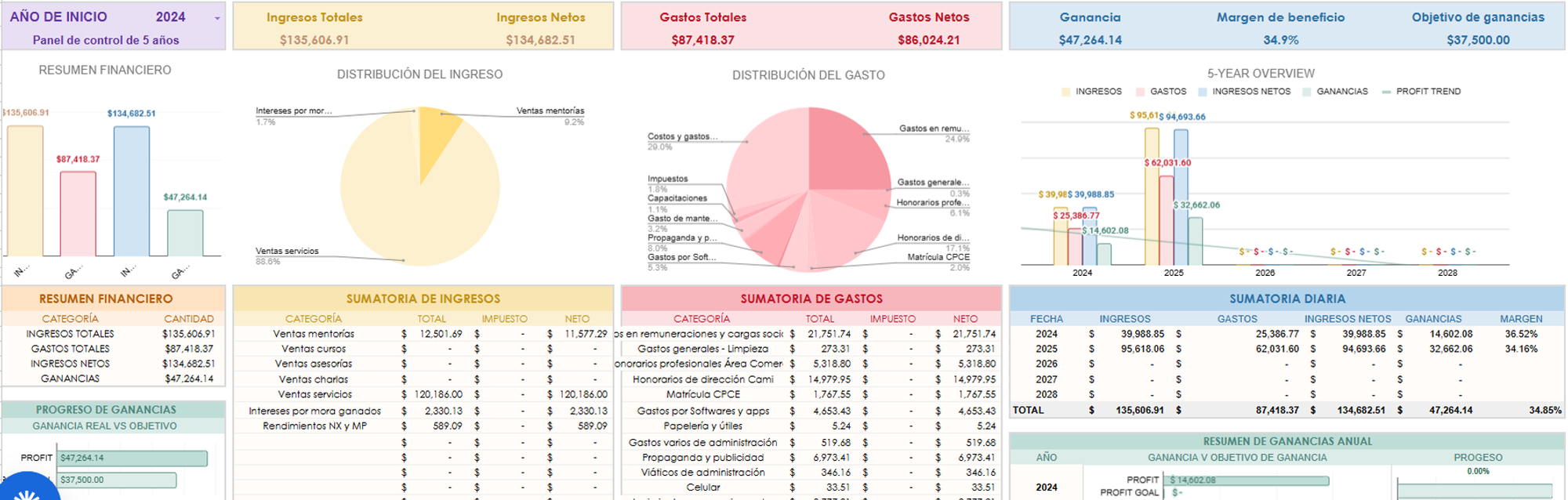 Incluye un tablero financiero automático, formularios simples de carga y videos grabados que te enseñan cómo implementarlo y cómo leer la información. Además, cuenta con una IA asistente que te ayuda a interpretar los indicadores, sin dar estrategias ni recomendaciones.